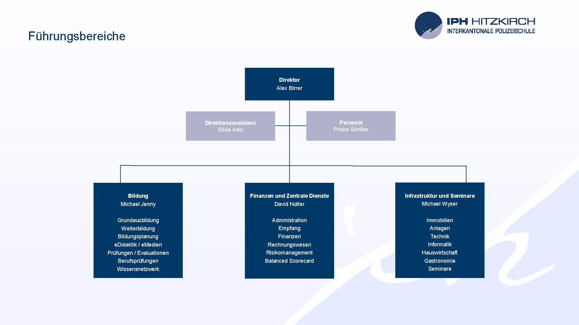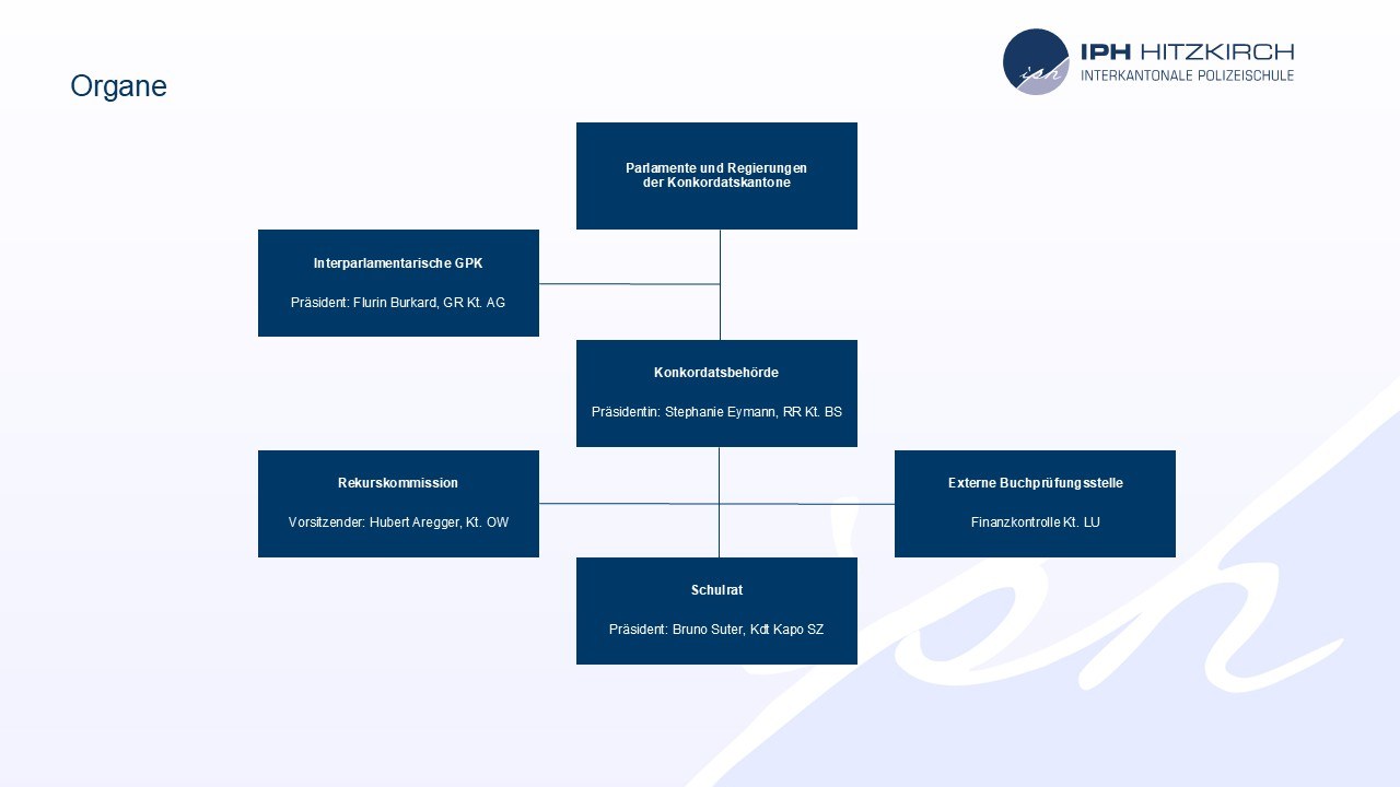 Die IPH Hitzkirch ist eine öffentlich-rechtliche Anstalt. Auf politisch-strategischer Ebene zeichnet die Konkordatsbehörde verantwortlich, für die Bildungsstrategie ist der Schulrat zuständig und die operativen Geschäfte unterstehen der Direktion. Die IPH Hitzkirch wird nach den Grundsätzen der Kunden-, Leistungs- und Wirkungsorientierung geführt.